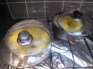 Potatoes destined for mashingDan, soon to be fired from green bean cutting dutyMixing up the pumpkin pie fillingDoing the dirty workGetting ready to dress the bird