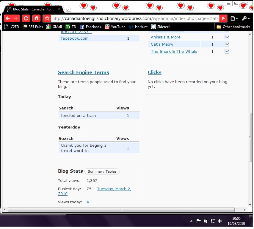 So, I was checking out my blog stats the other day when I came across something, well, let’s call it interesting. For those of you who don’t know, or don’t have a blog, there is a page that shows your site’s statistics; things like how many people viewed your site, what entry was most popular, most commented post, etc. There is also a section for how viewers got to your site, so what link they clicked on and from where (mine are mostly linked back to Facebook because that’s where I regularly post links). What was interesting on this recent visit was in the “search terms” section.