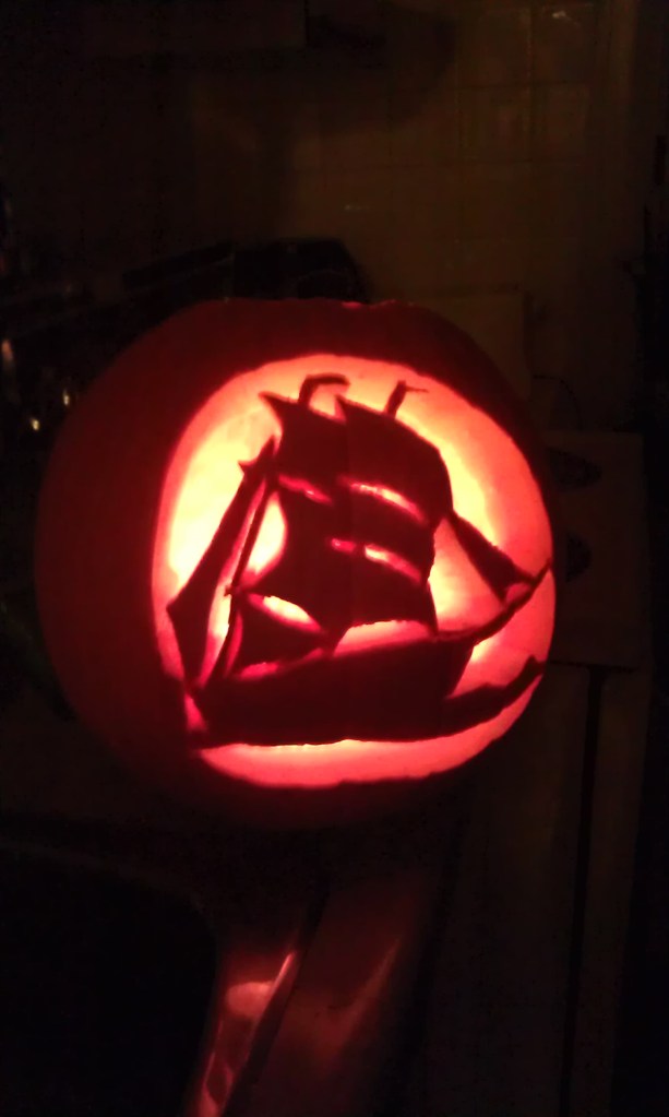 My second attempt was a pirate ship, to honour the pirate heritage of my new house back in Toronto. This house has a long and proud history of welcoming pirates out from the cold (and then back into the cold to do tug of ward contests, fire cannons, hoist sales, etc.). I felt, as the new kid on block, that I should show my solidarity by dedicating my pumpkin to the pirate-cause. Contrary to everything we think we know about pirates, this pumpkin did not get stolen.