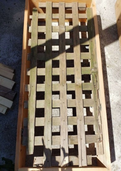 - You want the lattice to slot into the frame with the brackets – inside measurements should be roughly 15in x 34in (planks are not exactly 1in thick, so double check on your frame).