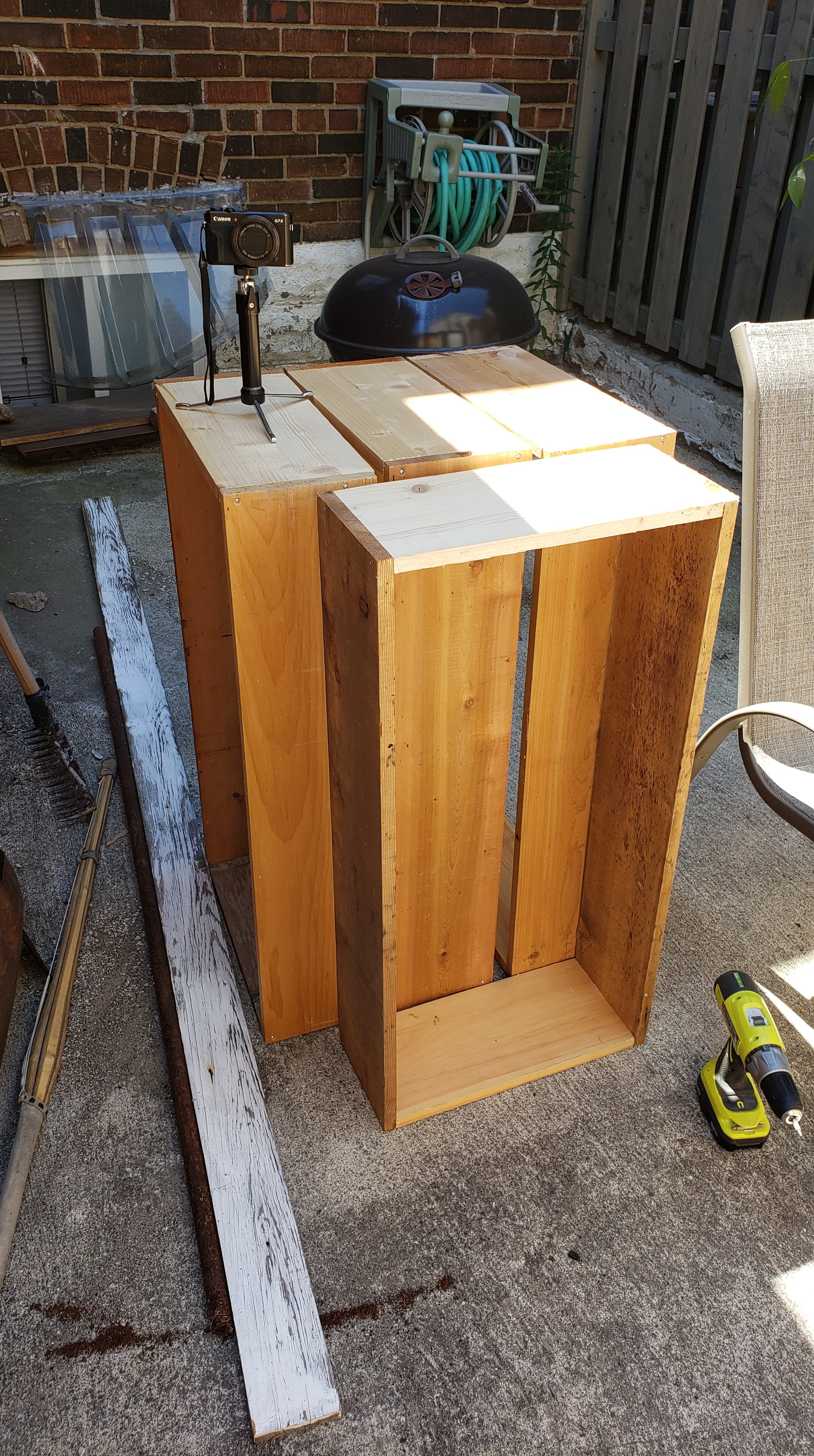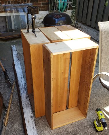 - Stand 15in plank upright and line up 36in plank on top, forming an L (the 15in pieces will be on the inside of the box).